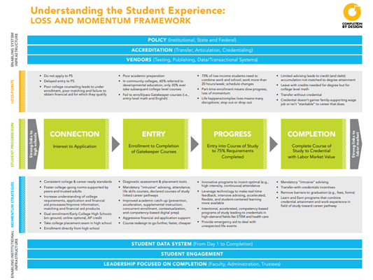 The Loss/Momentum Framework (LMF) is one of several frameworks that lay out an approach to institutional transformation at a high level. Specifically, the LMF prioritizes better understanding the student experience and using that understanding to identify specific areas within the institution for reform and redesign.